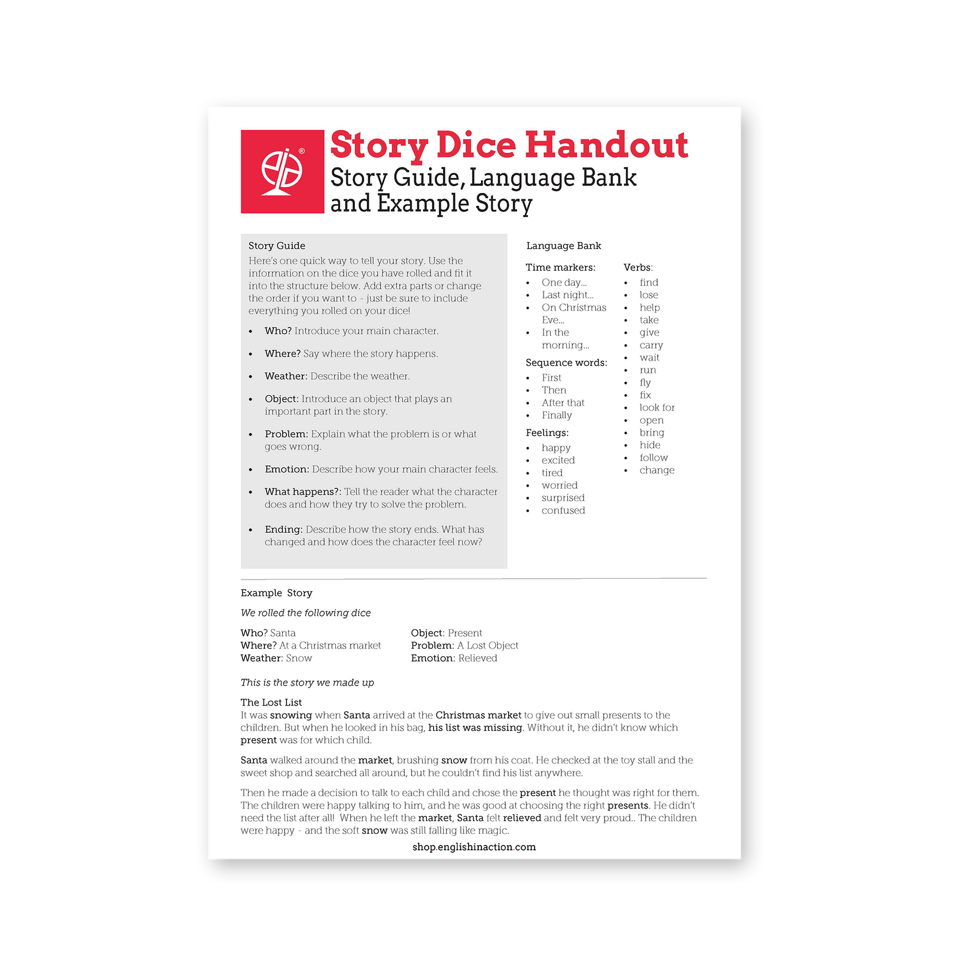 Students roll, check their prompts and shape a story that connects all the elements. They can tell it aloud, take turns adding sentences or write a short version. The pack also includes a story guide, language bank and example story to support learners who need more structure.