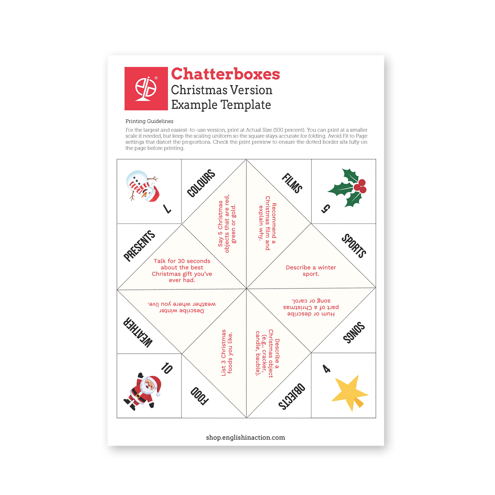Add a festive twist to a classic classroom favourite with Christmas Chatterboxes, a quick, interactive EFL speaking game where students practise vocabulary, fluency and question-response skills while using a foldable chatterbox filled with Christmas-themed topics and tasks.