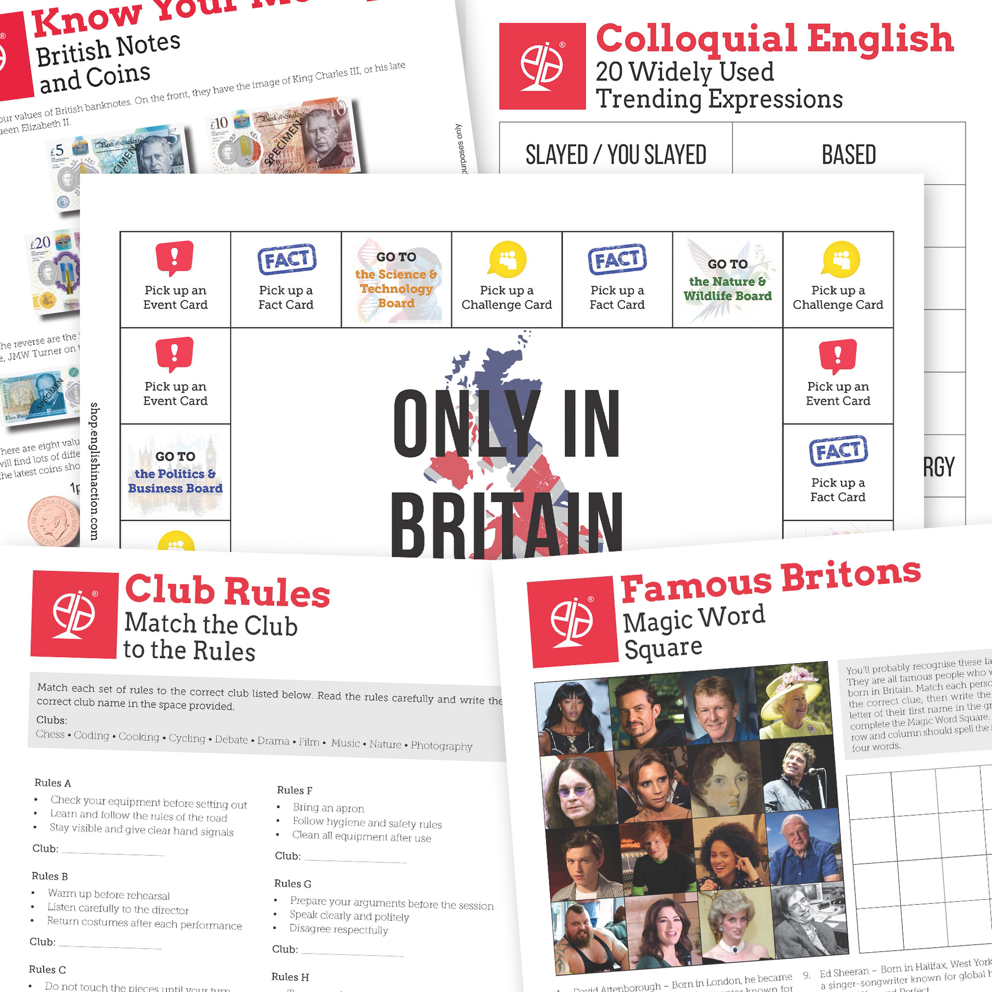 - Only in Britain Board Game – A cultural board game where students complete quick-fire challenges, collect Culture Tokens and apply what they have learned in a lively, team-based format.